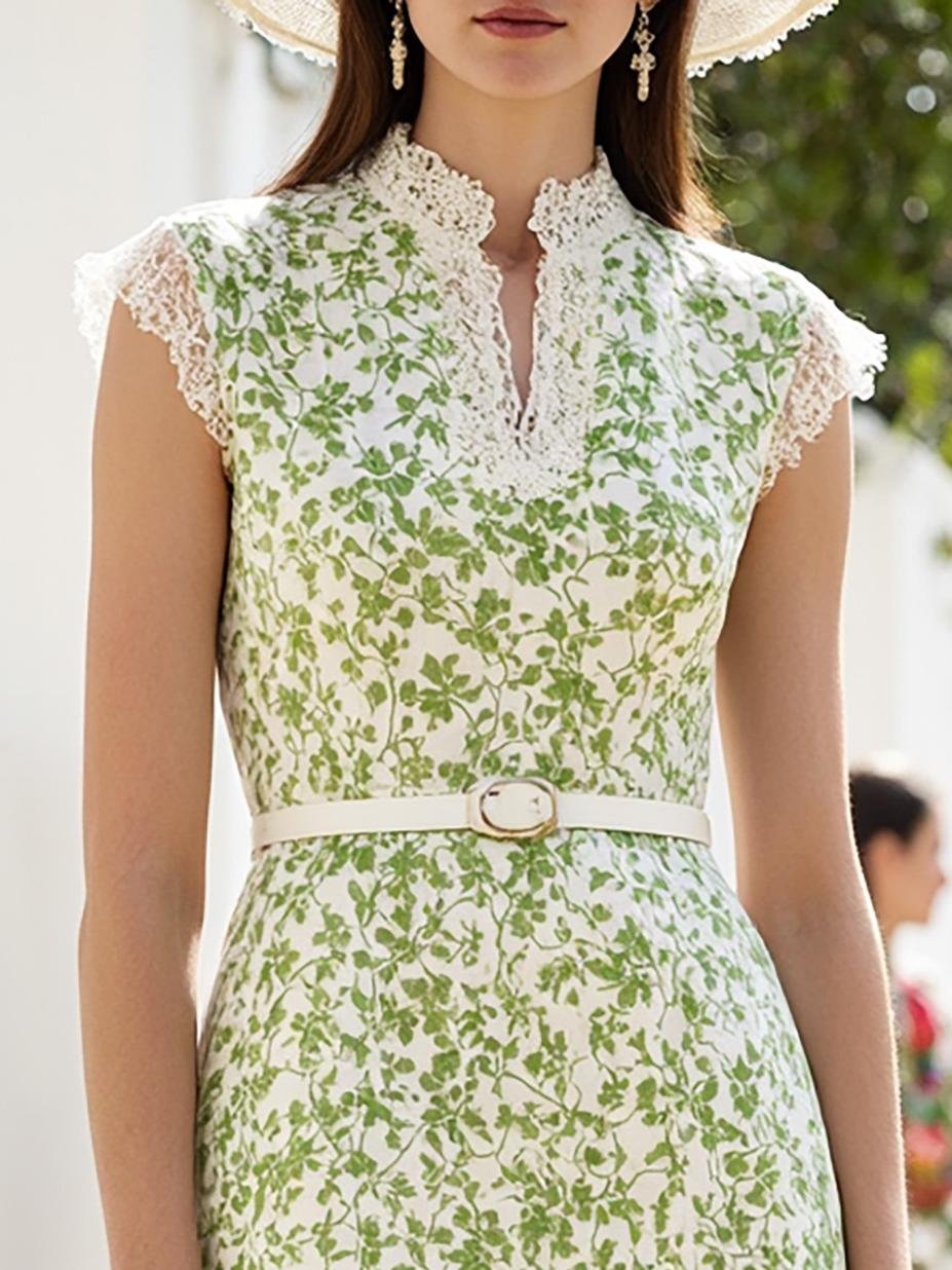 Midi Linen Dress , Cap Sleeves, V Neck, Floral, Lace, French Vintage, Aqua